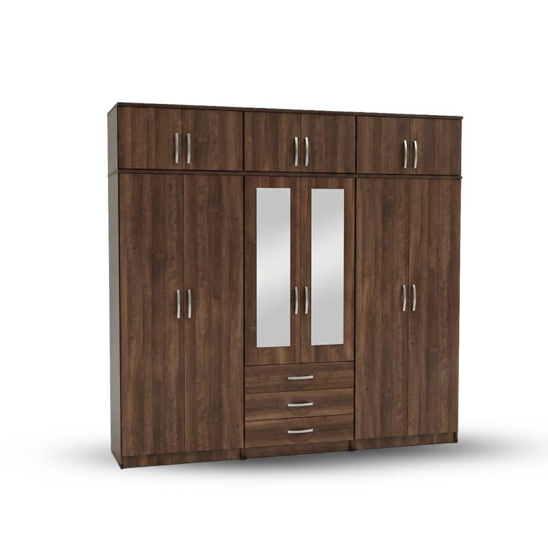 Walnut Brown 6-Door Mirror Wardrobe with Top Storage & Drawers
