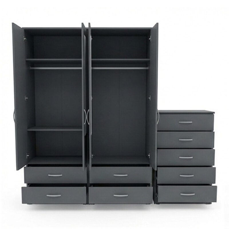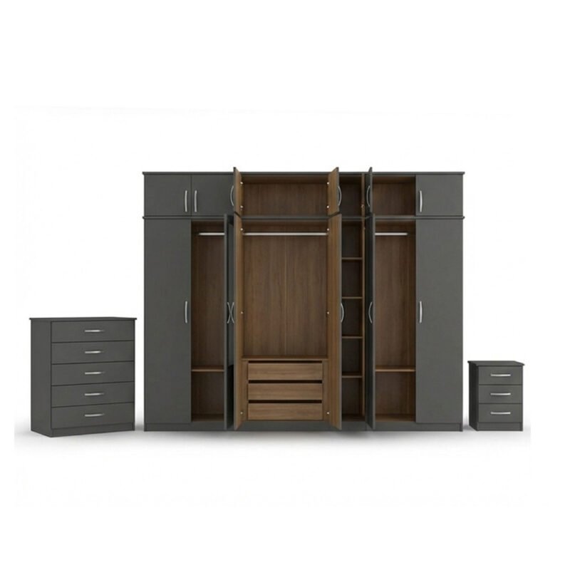 Charcoal Grey Mirror-Finish Multi-Door Wardrobe with Drawer Chest
