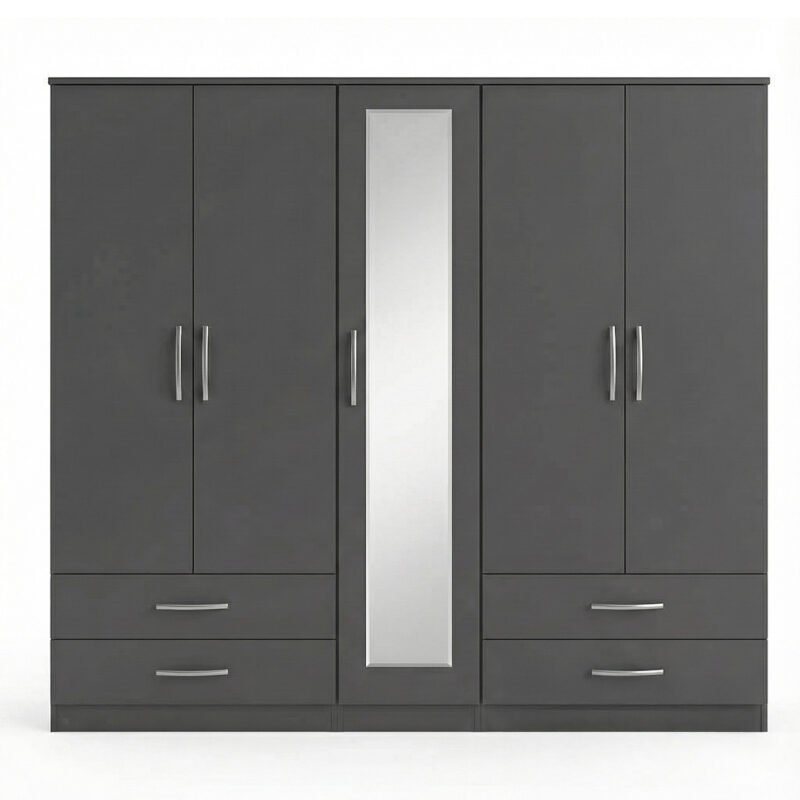 Charcoal Grey 5-Door Mirror Wardrobe with Bottom Drawers