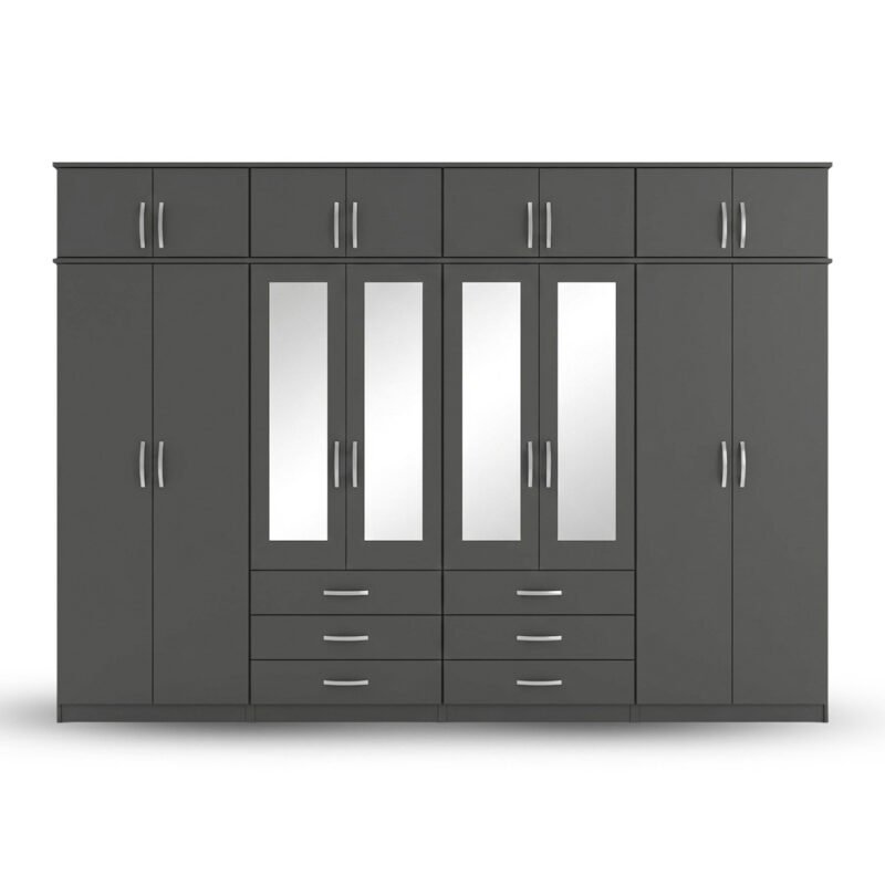Charcoal Grey 8-Door Mirror Wardrobe with Top Storage & Drawers
