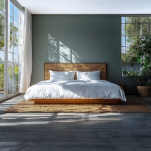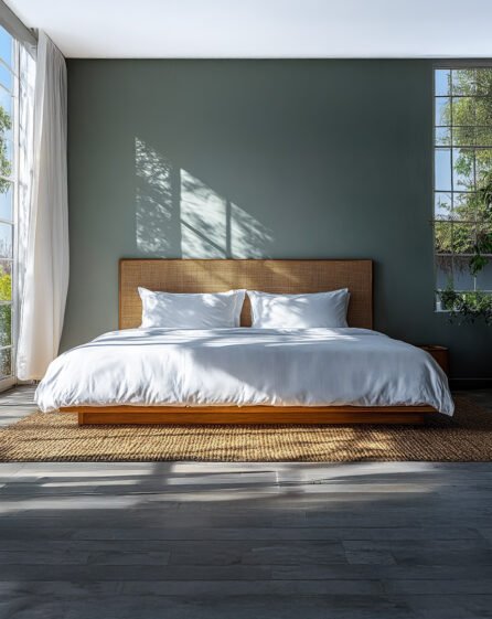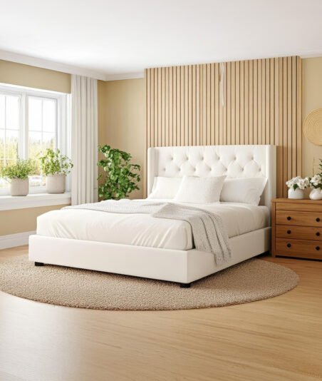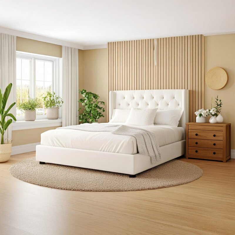White Upholstered Bed with Wooden Panel Accent