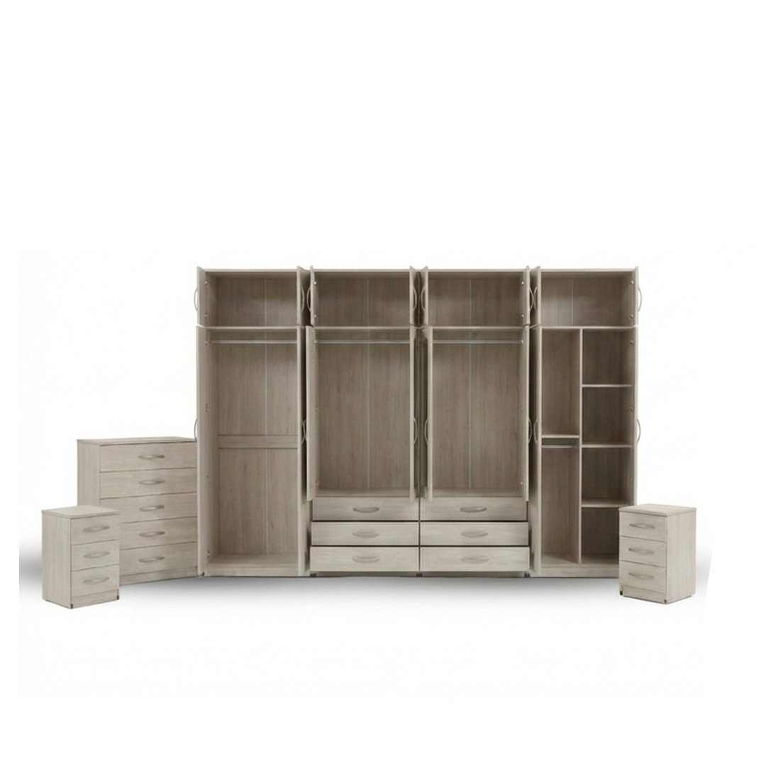 The set is completed with matching Ivory Oak drawer units—one tall chest and two compact side units—perfect for storing clothes, accessories, and daily essentials. With a durable build, clean lines, and sleek metallic handles, this wardrobe set delivers the perfect blend of luxury, functionality, and modern design.