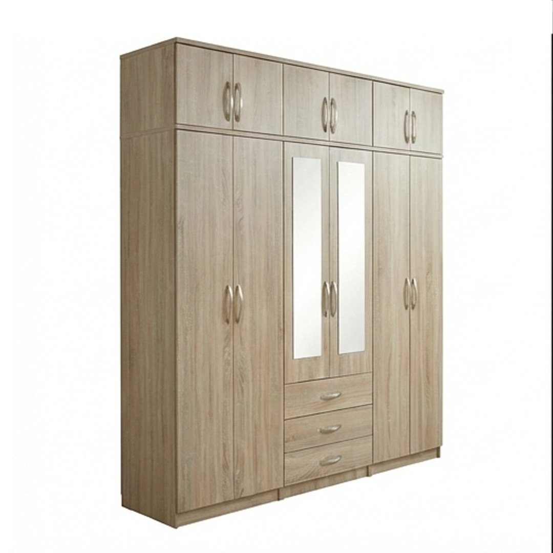 This spacious wardrobe is finished in a warm Natural Oak colour, adding a timeless and elegant touch to your bedroom. The 6-door design provides ample storage with multiple hanging sections and shelving for organised clothing. The centre doors feature full-length mirror panels for convenient daily use.