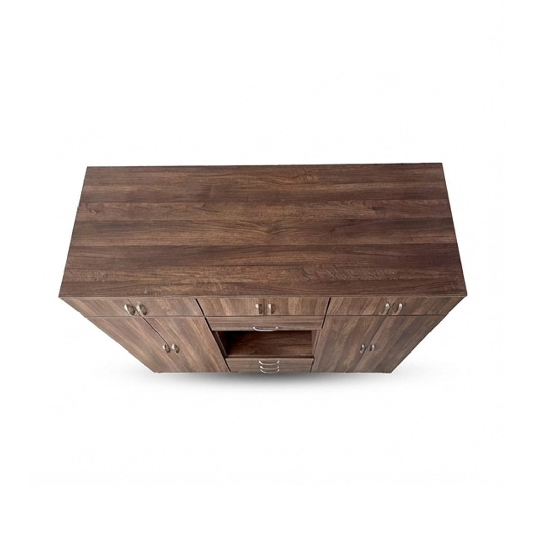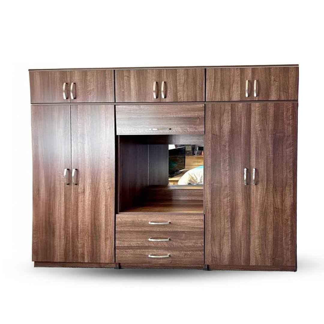 This stylish wardrobe is finished in a rich Teak Brown colour, offering a warm and elegant look for any bedroom. Designed with spacious side cabinets for hanging and folded clothes, it also features overhead storage cupboards for added convenience.