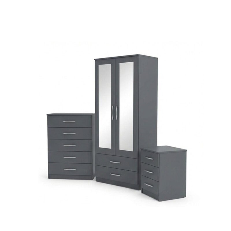 Graphite Grey Mirror Wardrobe Set with Drawer Chests